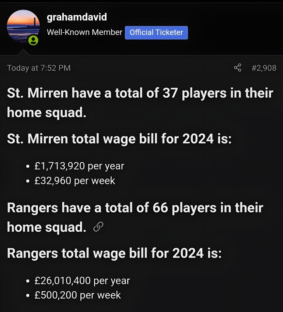 Someone much cleverer than us at Consilium looked into last night, and Rangers wage bill is around 15 times larger than ours: